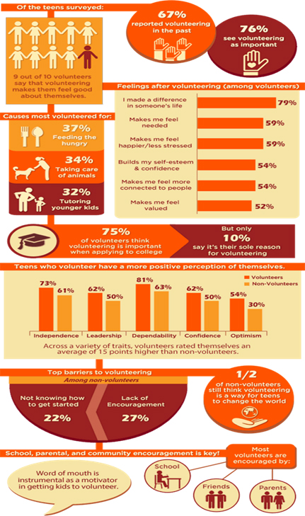 - Perhaps the reason why is because teen volunteering is a virtuous cycle. While teenagers cite “helping others” as a top reason for wanting to volunteer, they acknowledge benefiting from the experience, too. Nine in 10 volunteers say that volunteering makes them feel good about themselves because they feel like they made a difference, felt needed and built self-esteem and confidence.Compared to non-volunteers, teens that volunteer have a more positive perception of themselves. Across a variety of traits – including independence, leadership, dependability, confidence, and optimism – volunteers rated themselves an average of 15 points higher than non-volunteers.The increased confidence extended to their perception of their skill sets. Analyzing their own skills in areas such as technology, communication and teaching others, volunteers rated their skills significantly higher than non-volunteers on every measure. Volunteers reported that they actively developed a number of skills through their service activities such as social skills, leadership and networking.Find out how you can start volunteering in your community! Talk to your teachers and counselors, or do your own research to find an opportunity that will help you give back. You can also check out the Prudential Spirit of Community project ideas at https://spirit.prudential.com/volunteer-ideas/volunteer-project-ideas